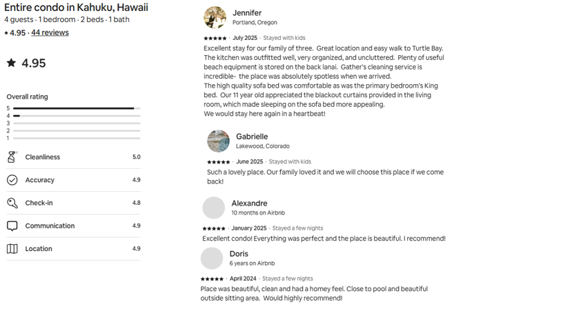 • Walking distance to Turtle Bay Beach, Lei Lei’s Bar & Grill, and Roy’s Beach House
